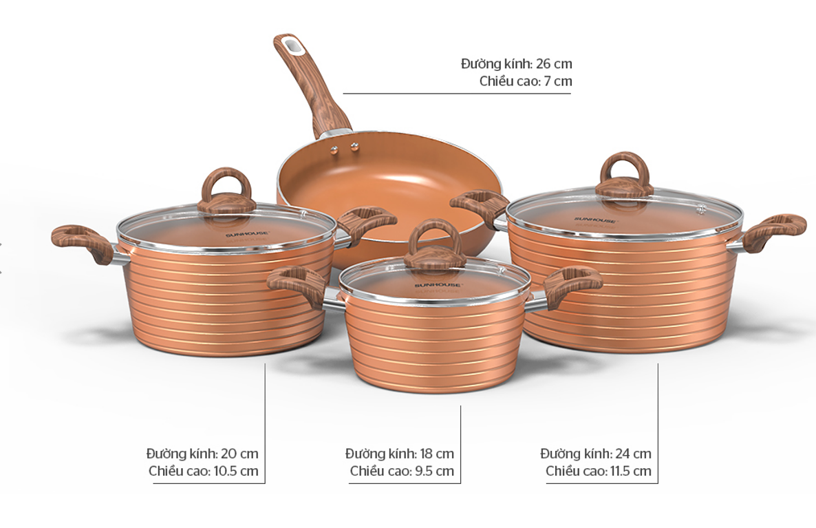 Bộ nồi, chảo với màu vàng đồng bắt mắt, làm sáng không gian bếp. Bên cạnh đó các sản phẩm được phủ sứ chống dính bên trong và sơn chịu nhiệt bên ngoài chống bám bụi, dễ dàng vệ sinh.