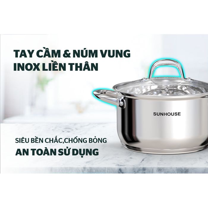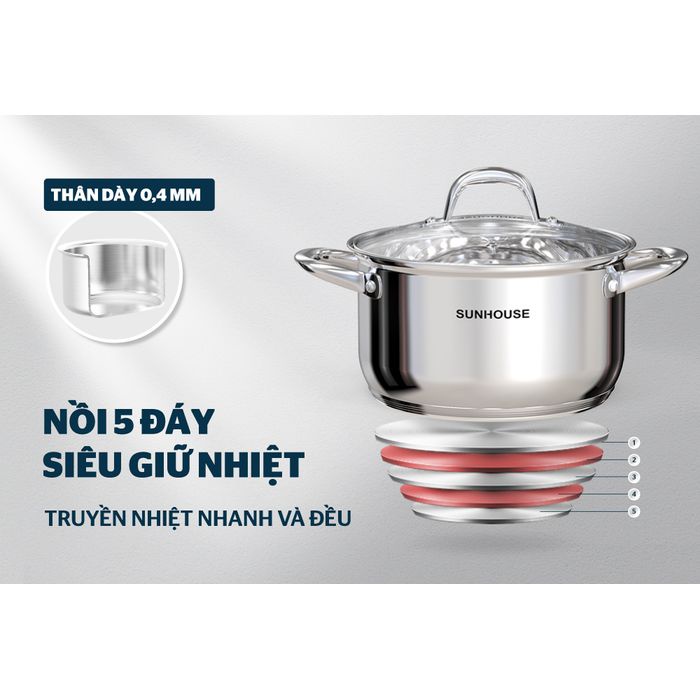 Bộ nồi inox 5 đáy SUNHOUSE SHG517 được làm từ chất liệu inox cao cấp với thiết kế 5 lớp đáy giúp tỏa nhiệt đều và tăng khả năng giữ nhiệt. Ngoài ra, nhờ kết cấu đáy dày nên hạn chế được tình trạng cháy khét.