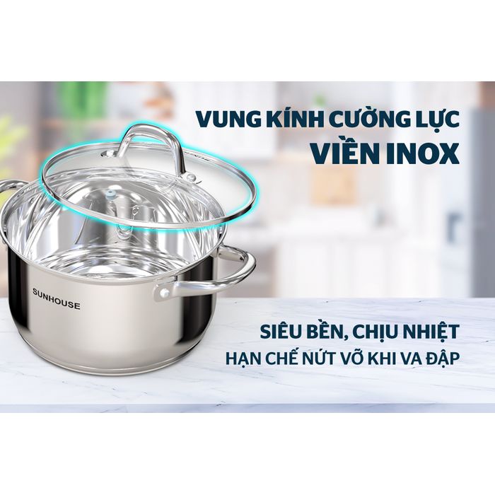 Bộ nồi inox 5 đáy SUNHOUSE SHG517 được trang bị vung kính cường lực, trong suốt giúp bạn dễ dàng quan sát thực phẩm bên trong nồi. Viền mép vung được bọc inox, vừa sang trọng, vừa hạn chế nứt vỡ khi va đập.