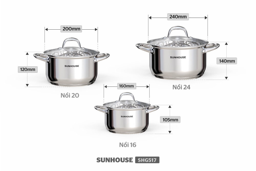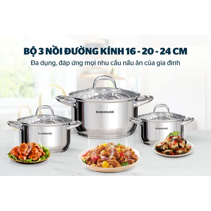 Bộ sản phẩm gồm 3 nồi với đường kính 16, 20 và 24 cm phù hợp với nhu cầu nấu nướng của mọi gia đình. Nồi cỡ nhỏ để kho thịt, luộc trứng và nấu lượng thức ăn cho 1 – 2 người; nồi vừa 20 cm để nấu canh cho 2 – 4 người và nồi lớn 24 cm có thể luộc gà, nấu canh hoặc lẩu cho 3 – 5 người.