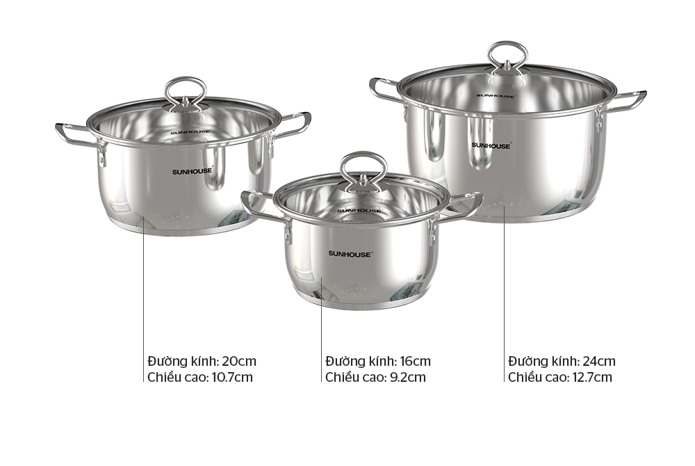Bộ nồi inox 5 đáy SUNHOUSE SHG788 sử dụng được với mọi loại bếp, kể cả bếp từ. Bộ sản phẩm gồm 3 nồi với đường kính 16cm - 20cm - 24cm phù hợp với nhu cầu nấu nướng của mọi gia đình. Nồi nhỏ 16cm thích hợp để luộc trứng, kho thịt, nồi cỡ trung 20cm để nấu canh cho 2-4 người và nồi lớn 24cm có thể luộc gà, nấu canh hoặc lẩu cho 3-5 người.