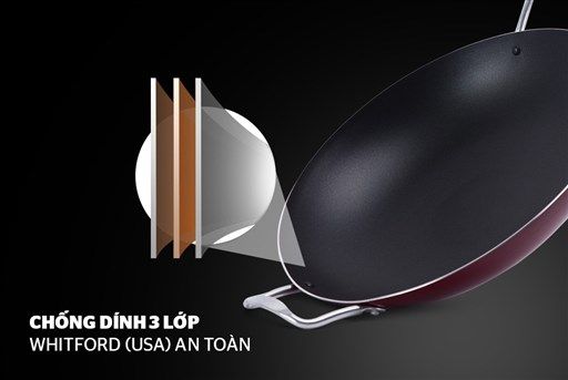 - Lòng chảo sâu, phủ chống dính cao cấp: Lòng chảo trơn nhẵn, phủ 3 lớp chống dính Whitford (USA) ít bám dầu, không dễ bong tróc.