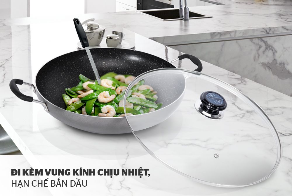Nắp đậy kín khít: Chảo được trang bị thêm một nắp đậy bằng vung kính cách nhiệt hạn chế bắn dầu, giữ nhiệt tốt hơn. Nắp vung bằng nhựa chịu nhiệt được bắt vít chắc chắn, dễ sử dụng.