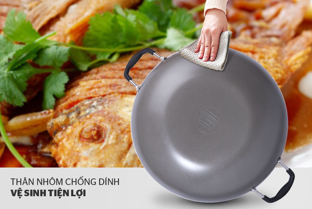 Lòng chảo sâu, phủ chống dính cao cấp: Lòng chảo trơn nhẵn, phủ 3 lớp chống dính Whitford (USA) ít bám dầu, không dễ bong tróc.