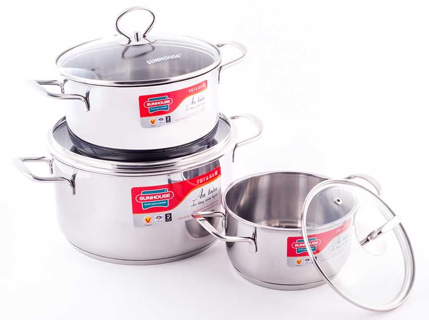 Đặc điểm nổi bật Cấu tạo 3 đáy dày dặn, chắc chắn, hạn chế cháy khét thực phẩm Quai được thiết kế chắc chắn, lực đỡ cao gấp 2 3 lần nồi thông thường Công nghệ viền mép nồi giúp nồi luôn chắc chắn trước sự va đập Thông số kỹ thuật Màu sắc Inox Số nồi 3 Kích thước 16 - 20 - 24 cm Chất liệu nồi Inox cao cấp Quai nồi Hàn bấm Núm cầm Bắt vít Vung nồi Kính cong, dày 4mm Đặc điểm khác Công nghệ viền mép nồi giúp nồi luôn chắc chắn trước sự va đập, bề mặt sáng bóng, vệ sinh dễ dàng Thương hiệu SUNHOUSE.