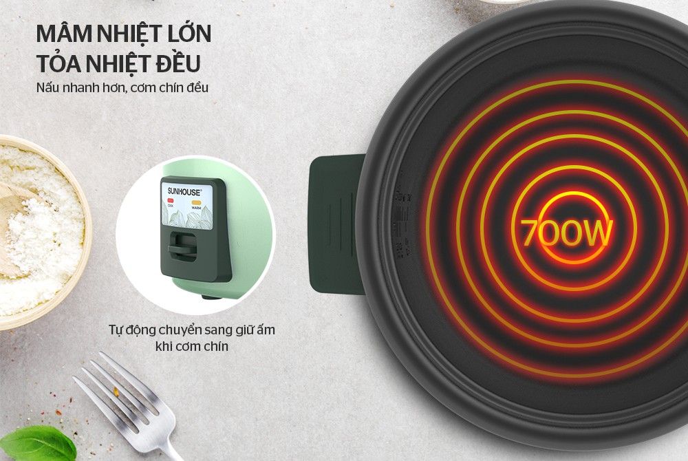 Nồi cơm điện SUNHOUSE SHD8133 được trang bị một mâm nhiệt lớn cùng công suất nồi 700W, nhiệt tỏa đều làm cơm chín nhanh và ngon hơn.